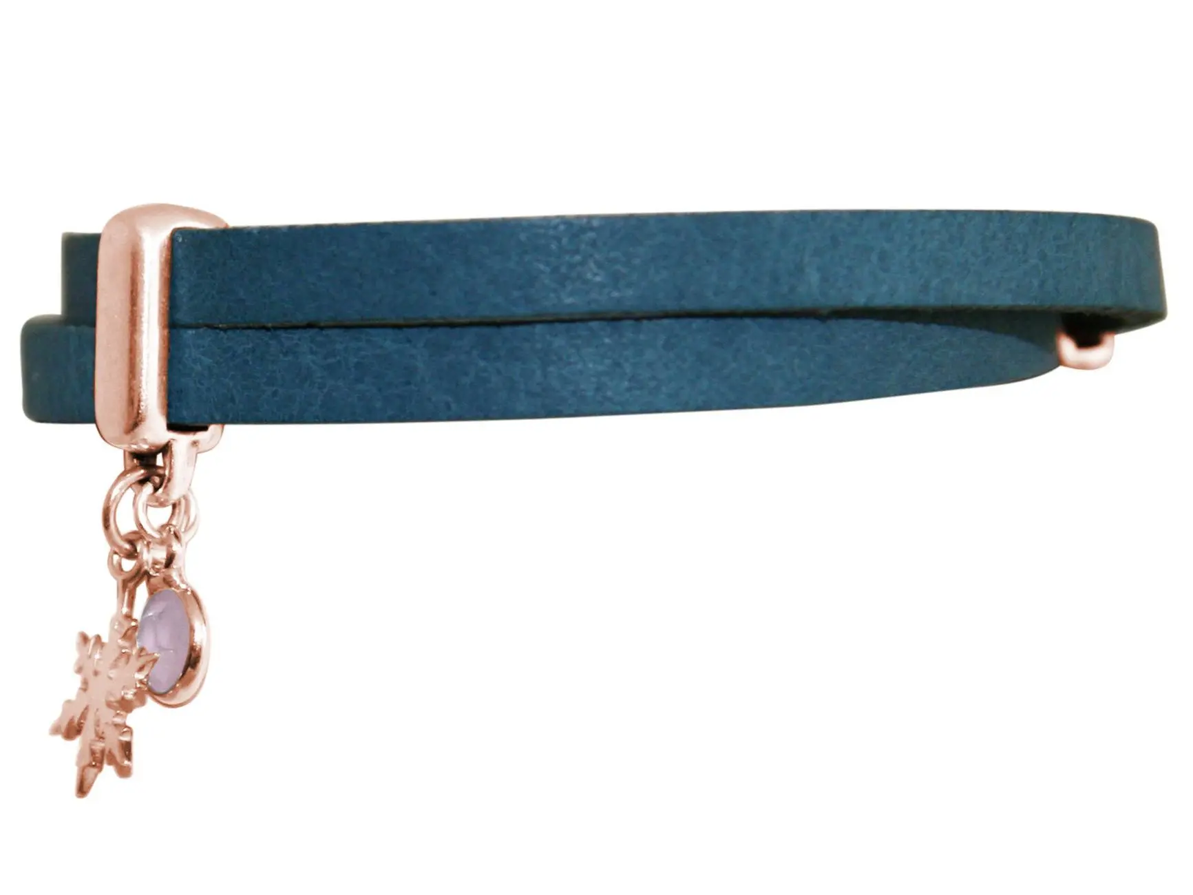 Gemshine double blue leather bracelet magnetic clasp, snowflake and rose quartz GEMSTONE 925 silver, gold plated, rose. Wrap bracelet. Made in Munich / Germany, metal color:silver rose gold plated.