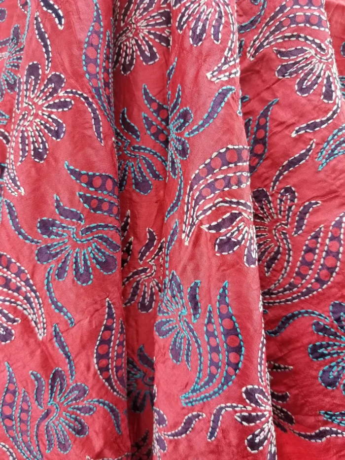 - Craft & Technique:The unique art of Kantha embroidery, passed down through generations, is a form of freestyle embroidery from India. This old ingenious art form involves an utmost labor-intensive process, as each intricate running stitch is done by hand. Daily life inspires Kantha embroidery craft. The most common motifs are derived from nature and surroundings, the sun, the tree of life, animals, oceans, flowers, and birds along with geometrical shapes from everyday activities. A finished piece compromises of multiple lines and motifs filled with running stitch, darn stitch, and satin stitch all over, bringing an authentic hand embroidered appearance.