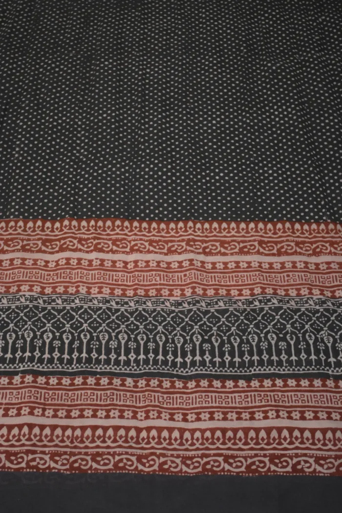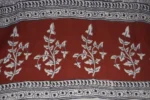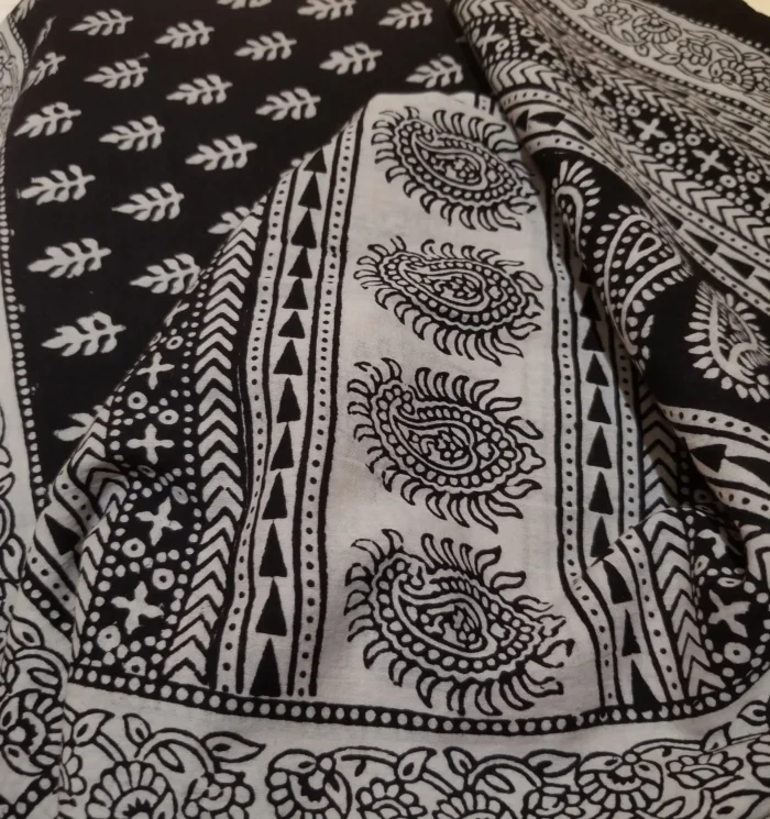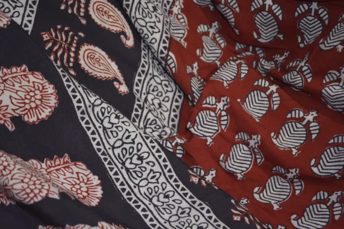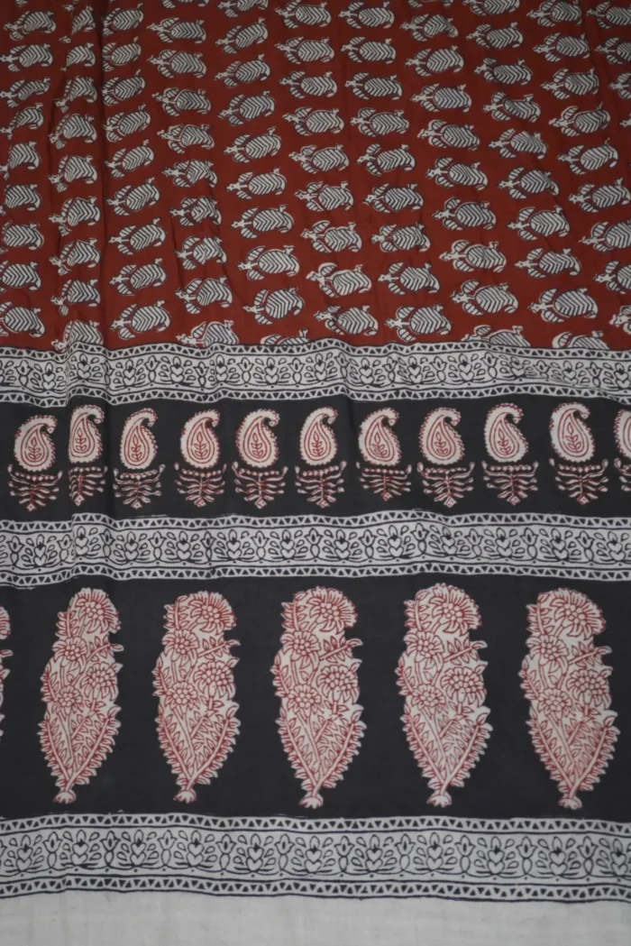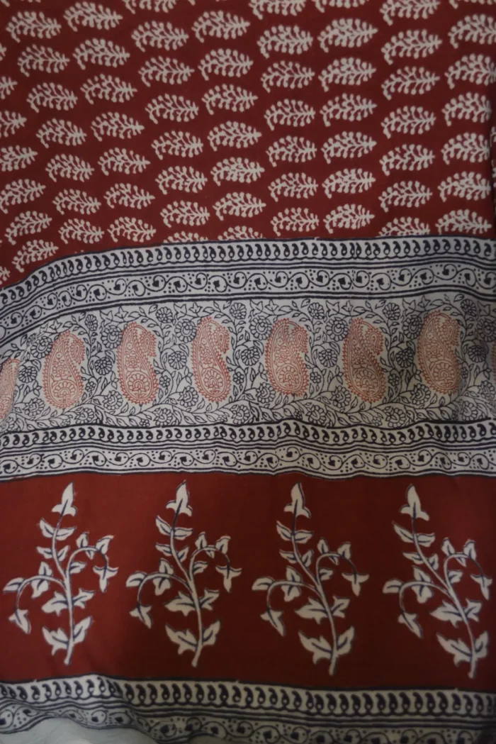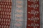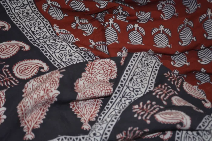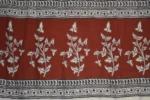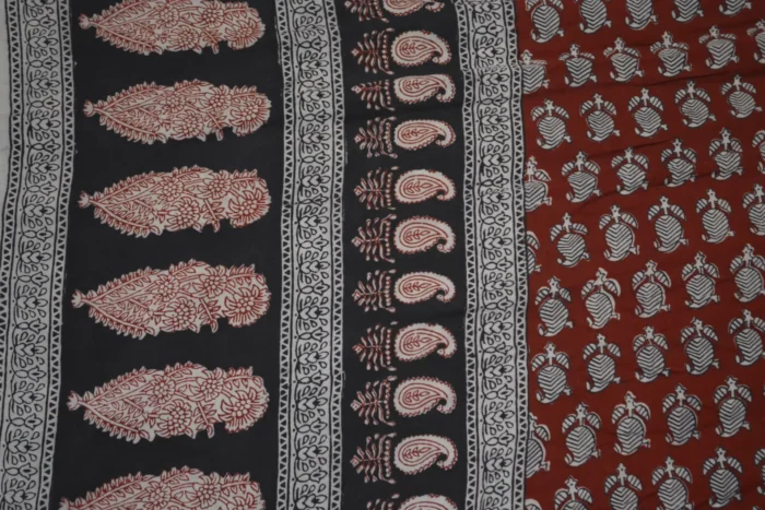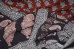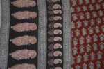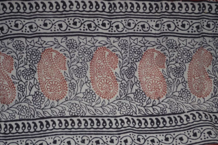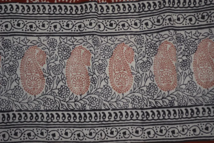 The fabric is also dyed with the plant dyes and the unique prints are derived from flowers, leaves, and barks and layouts are dramatic with the use of black and red alternately over beige featuring florid vines & ornate honeycomb borders and usually has traditional paisleys, geometrical patterns, tiny florets, buds and vine motifs with a vintage feel. The printing is done by the skilled artisans of India and the perfection of this technique is so good, that the patterns look almost as flawless as machine printed and this art form is truly magnificent.