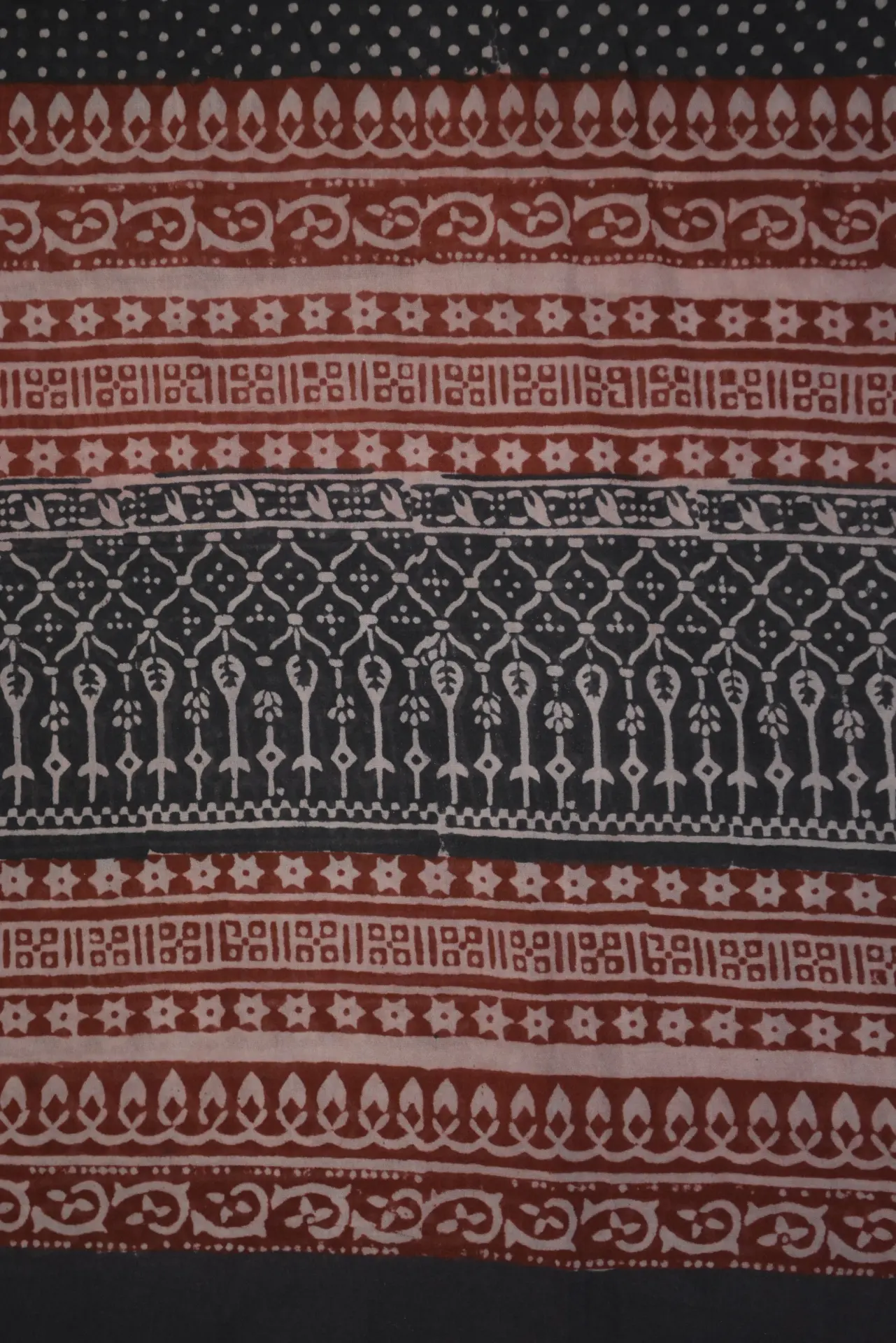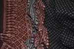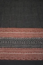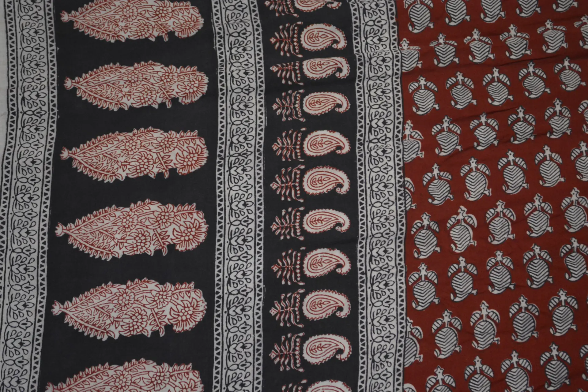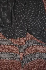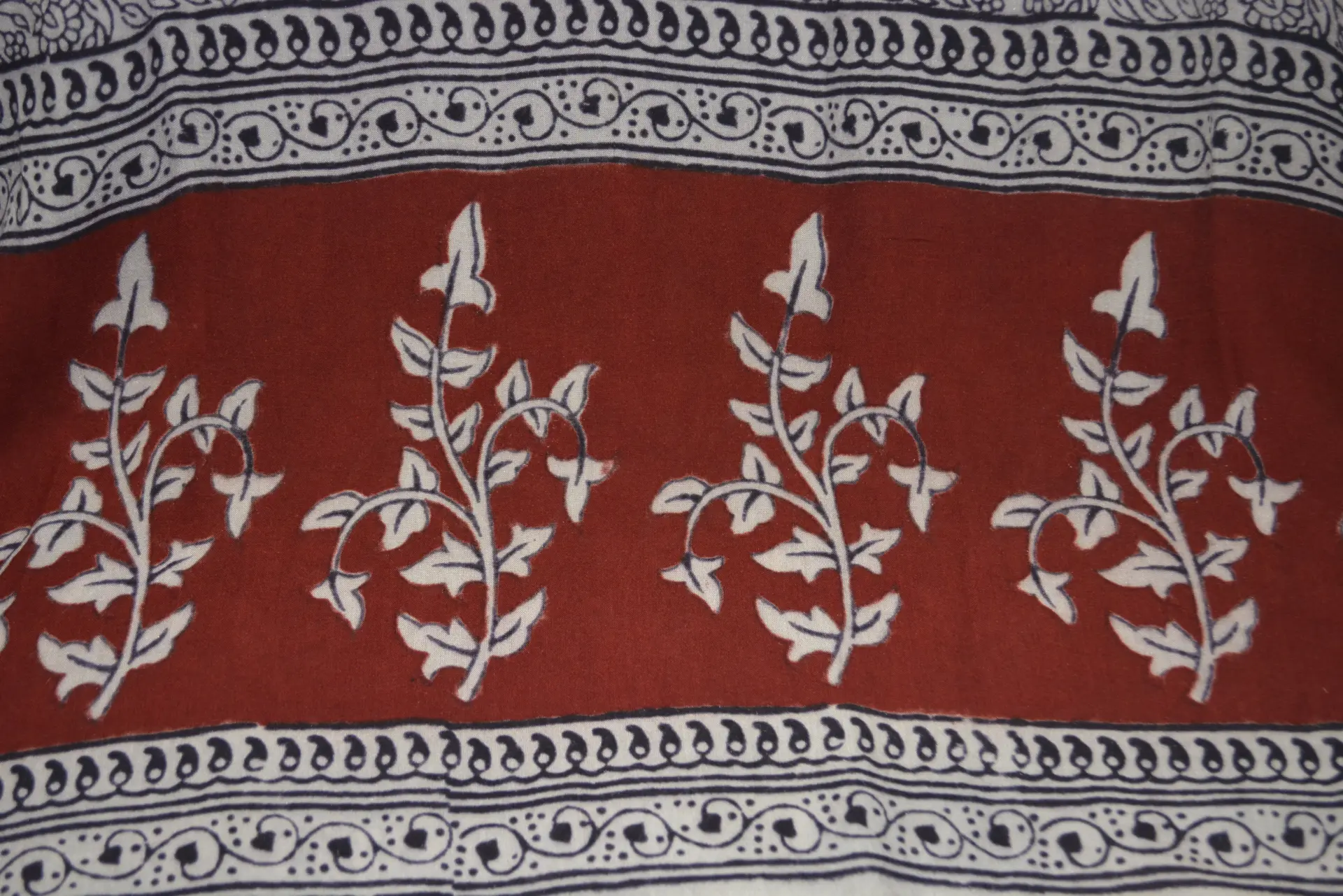 The fabric is also dyed with the plant dyes and the unique prints are derived from flowers, leaves, and barks and layouts are dramatic with the use of black and red alternately over beige featuring florid vines & ornate honeycomb borders and usually has traditional paisleys, geometrical patterns, tiny florets, buds and vine motifs with a vintage feel. The printing is done by the skilled artisans of India and the perfection of this technique is so good, that the patterns look almost as flawless as machine printed and this art form is truly magnificent.