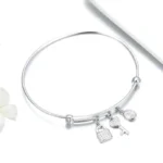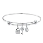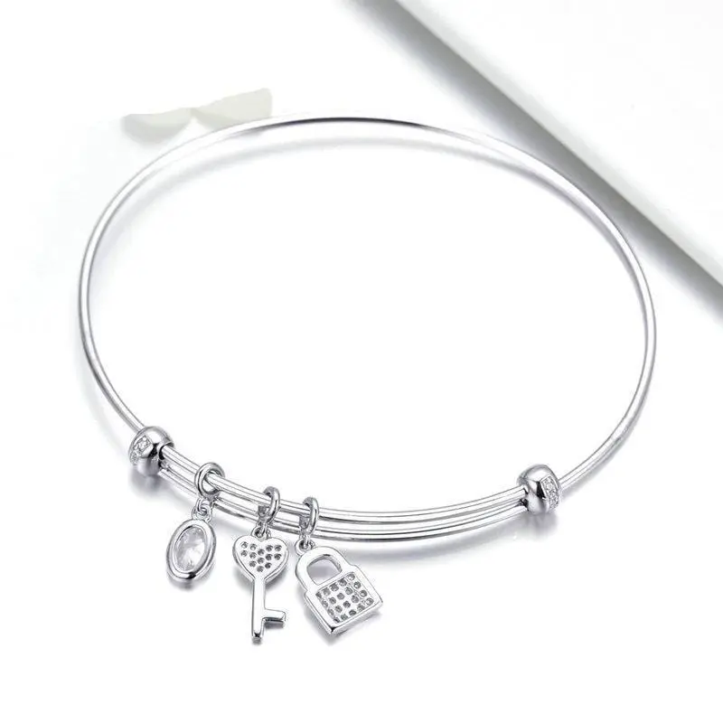 Silver Key and Lock Bangle. Simple and adjustable, this gorgeous silver bangle features a number of attractive charms and can be shaped to your exact wrist size. The adjustable clasps are studded with sparkling cubic zirconias and the bangle itself is crafted from a high polish sterling silver. The set of three charms are also studded with zirconia crystals and include a beautiful lock and key.