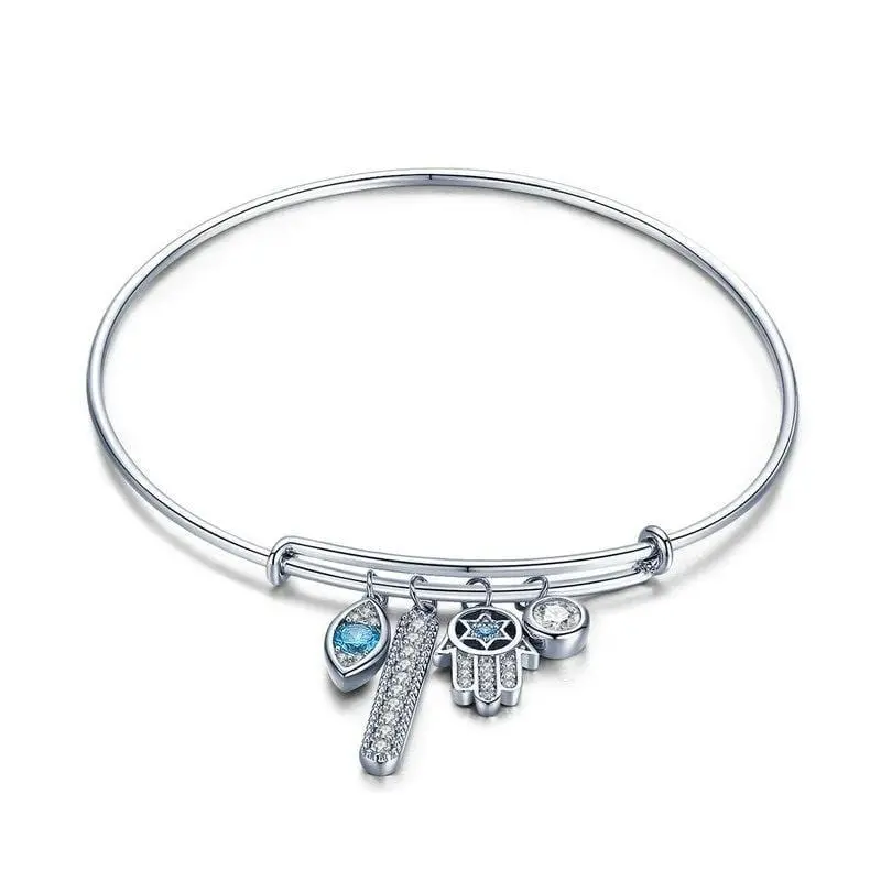Beautiful multi-charm Sterling Silver Hamsa protective bracelet featuring 4 single paved Cubic Zirconia charms in clear and topaz blue. A beautiful gift for friends who are travelling or embarking on a new journey in their life.